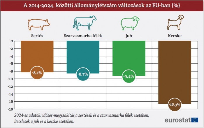 2024-ben Európában az állatállománylétszámok a főbb állattenyésztési ágazatokban csökkenést mutattak, ezzel tovább folytatódott az elmúlt években megfigyelt negatív tendenciát. A sertések száma például megközelítőleg 132 millióra csökkent, ami 0,5%-os csökkenést jelent az előző évhez képest. A csökkenés még jelentősebb volt a szarvasmarhák esetében, amelyek létszáma 2,8%-kal, megközelítőleg 72 millió állatra csökkent. A juhok létszáma is visszaesett 1,7%-kal, 57 millióra egyedre, míg a kecskéké 1,6%-kal csökkent, így létszámuk az unióban megközelítőleg 10 millió egyedet tesz ki jelenleg. Ezek a számok nem átmeneti létszámingadozásokat mutatnak, hanem egy állandósulni látszó tendenciát, amely minden főbb állatfajt érint, függetlenül a földrajzi területtől, ami egy mélyebb, strukturális változásra utal.