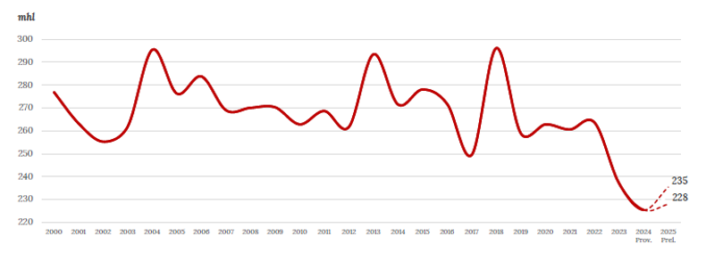 Az OIV (Nemzetközi Szőlészeti és Borászati Szervezet) friss előrejelzése szerint 2025-ben várhatóan 232 millió hektoliter bor készül világszerte, ami ugyan kis mértékű, 3%-os növekedést jelent a 2024-ben tapasztalt történelmi mélyponthoz képest, ám a globális termelés továbbra is 7%-kal elmarad az ötéves átlagtól. A világ bortermelése immár harmadik éve tartósan alacsony szinten stabilizálódik, ami elsősorban a szélsőséges időjárás és a fogyasztási szokások átalakulásának következménye.