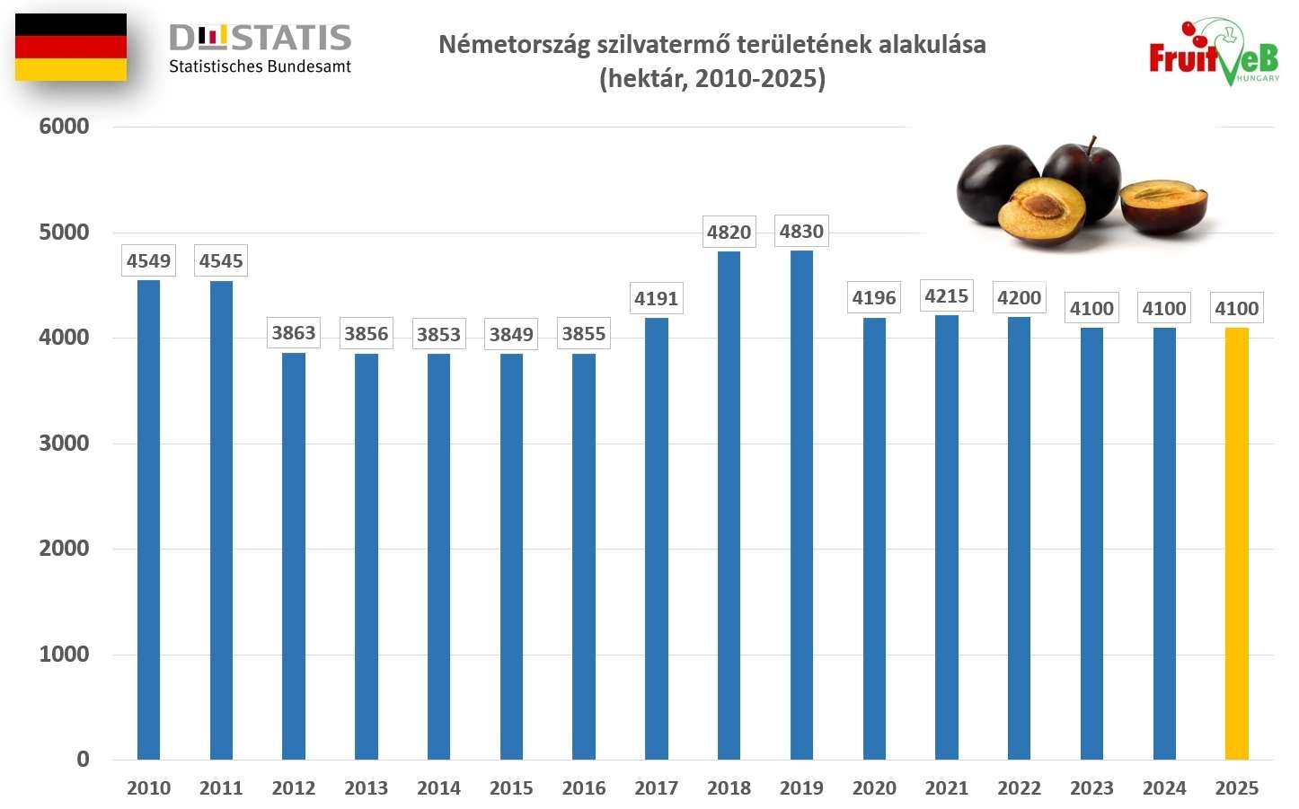 A Destatis adatai szerint Németország 2025-ös szilvatermése 51,3 ezer tonna körül alakult, ami még a a júliusban közzétett 44,5 ezer tonnás előrejelzésnél is lényegesen magasabb, és az előző évhez viszonyítva 17,1%-os, mintegy 7500 tonnás bővülést jelent. A 2015–2024 közötti időszak átlagához mérten szintén 17,2%-kal bővült a termés.