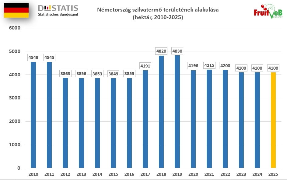 A Német Szövetségi Statisztikai Hivatal (Destatis) előzetes becslése szerint az idei belföldi szilvatermés volumene 44,5 ezer tonna lesz, ami 700 tonnával (+1,6%) lesz magasabb, mint a 2024-es évben betakarított mennyiség, illetve az elmúlt tízéves átlag (mindkettő 43,8 ezer tonna).