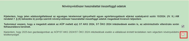 A fenti nyilatkozat megtételére az Egységes kérelem adatváltozás bizonylat keretében 2026. január 2. napján megnyílt a lehetőség. Így amennyiben nem alkalmaztak semmilyen növényvédőszert egyik táblájukon sem, abban az esetben az Egységes kérelem keretében egyetlen mező bejelölésével teljesíthetik az adatszolgáltatási kötelezettségüket.