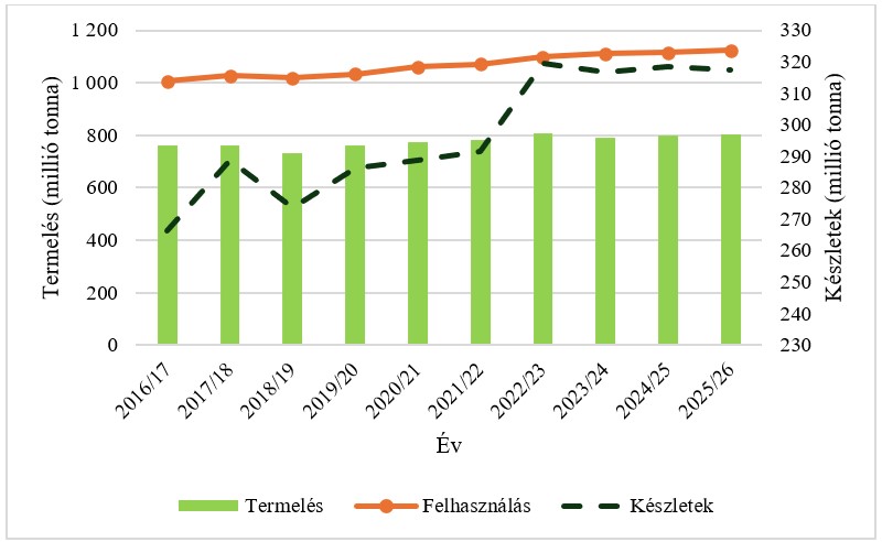 2. ábra: A világ búzatermelése, felhasználása, készletek 2015/16 és 2024/25 között