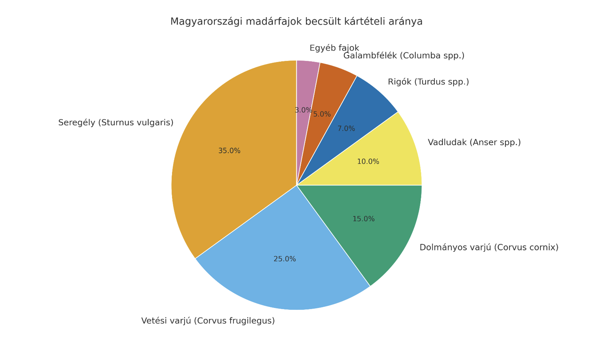 Itt látható a kördiagram, amely bemutatja a magyarországi madárfajok becsült kártételi arányát a mezőgazdasági kultúrákban.