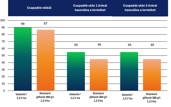 1. ábra Halvetic® hatékonysága a csapadék függvényében standard glifozátkészítményhez hasonlítva (Forrás: Qemetica, https://halvetic.com/hu)