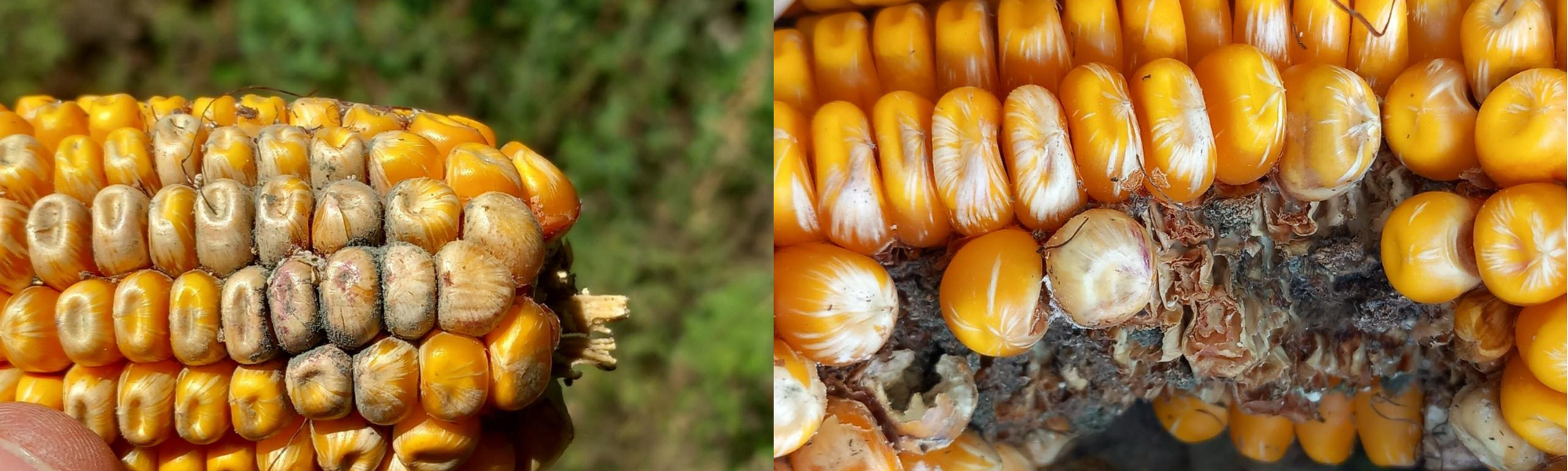 Balra Aspergillus flavus okozta fertőzés, jobbra Fusarium spp. kukoricában (Fotó: KITE Zrt.)
