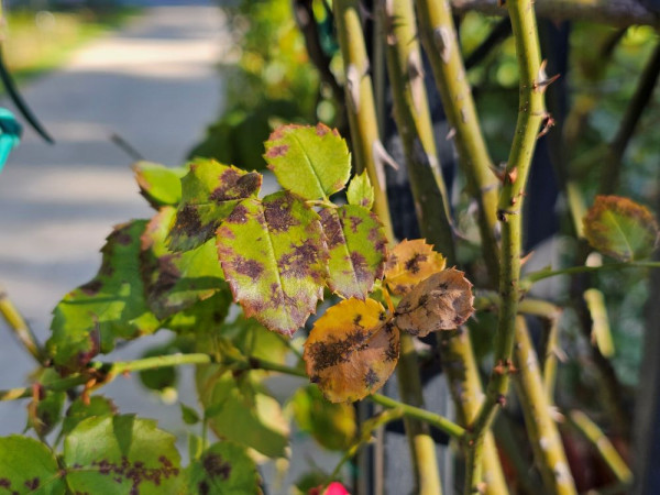 Érdemes leszedni a rózsáról a csillagpenészes (diplokarponos) leveleket és a már lehullottakat is célszerű összegyűjteni. Hűvös, nedves tavaszon a rózsán maradt vagy a lehullott levelekről fertőzheti meg a gomba újra a növényt, akár teljes lombhullást is okozva (2. kép). Száraz, meleg időjárásban leáll a terjedése, ebben hasonlít az őszibarack tafrinás betegségére.