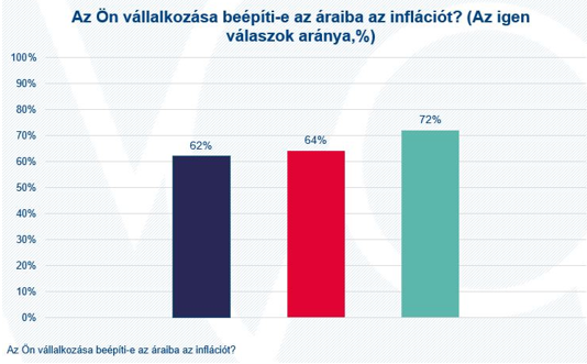 Az inflációval kapcsolatban arra hívta fel a figyelmet Kozák Ákos, hogy 2023 és 2025 között – a csökkenő drágulási ütem mellett is – érdemben (10 százalékponttal) nőtt azoknak a vállalkozóknak az aránya, amelyek az inflációt tudatosan beépítik áraikba, ami a nagy inflációs sokk tartós hatását jelzi a vállalati döntéshozatalban. Az árképzés így nem átmeneti reakció, hanem beépült alkalmazkodási mechanizmus lett.