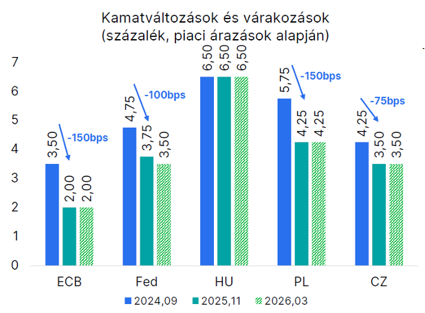 Ugyan a nagy jegybankok és némely régiós intézmény is már a kamatok csökkentése mellett döntött, a Magyar Nemzeti Bank (MNB) monetáris politikájában továbbra is a stabilitás fenntartására törekszik. A magyar jegybankot láthatóan aggasztják a magasabb inflációs várakozások, illetve a pénzromlás ütemének esetleges emelkedése az árrésstop kivezetése után. Az MNB az inflációs célsávot továbbra is a szigorú monetáris kondíciók, valamint a pozitív reálkamat biztosításával tartja fenntartható módon elérhetőnek. Mindezek alapján az Erste elemzői szerint a kamatok csökkentésére 2026 vége felé lehet esély.