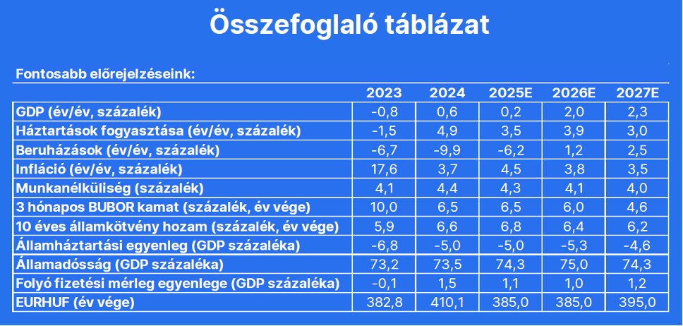 Az idei 0,2 százalék után jövőre 2 százalékkal bővülhet a magyar gazdaság. Az árrésstop esetleges kivezetése átmenetileg megemelheti a pénzromlás ütemét, ugyanakkor a szigorú monetáris kondíciók miatt összességében az átlagos infláció lassulására lehet számítani 2026-ban. A hazai és a külföldi kamatok közti, várhatóan tovább emelkedő különbözet erős támaszt nyújt a hazai fizetőeszköznek. Egy euró idén és jövő év végén is 385 forint körül lehet.