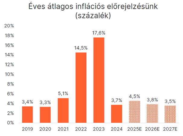 Az infláció jövőre 3,8 százalék lehet a 2025-re várt 4,5 százalék után. Jelenleg az árrésstop, a viszonylag erős szinten stabilizálódó forintárfolyam, és a termelői árak csökkenése fékezi a pénzromlás ütemét, ugyanakkor a piaci szolgáltatások továbbra is viszonylag gyorsan drágulnak, és a lakossági inflációs várakozása is magas szinten ragadt. Továbbra is bizonytalan, hogy a kormányzat mikor vezeti ki az árrésstopot. Amennyiben ez jövőre megtörténik, a várható egyszeri hatás miatt a pénzromlás tempója 2026-ban sem marad tartósan a jegybanki célsávban – erre legkorábban 2027-től lehet számítani.