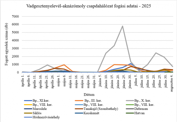 A legtöbb előrejelző ponton csökkent a fogott egyedek száma. Budapest VIII. kerület, Debrecen és Kecskemét előrejelző pontokon nem figyeltek meg vadgesztenyelevél-aknázómolyt. A legtöbb egyedet (720 db) Budapest X. kerületben detektálták.