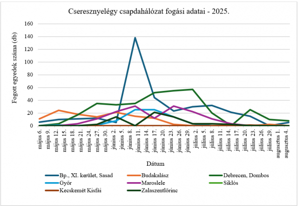 Sasad és Debrecen előrejelző pontokon figyeltek csak meg cseresznyelégy imágót. Debrecenben detektálták a legtöbb egyedet (8 db).