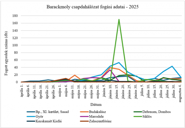 Csökkent a barackmolyok száma a csapdákban. Kecskemét és Zalaszentlőrinc előrejelző pontokon nem figyeltek meg barackmolyt. A legtöbb imágót (13 db) a győri előrejelző ponton detektálták.