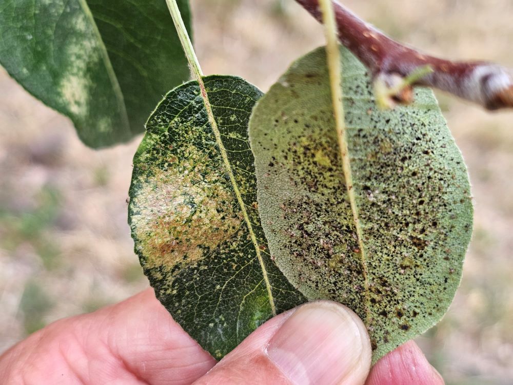 A meleg visszatértével a takácsatkák is újra támadásba lendülhetnek. Ritkán látott kártevők is megjelenhetnek pl.: a körte recéspoloska. A levél színén a szívásnyomait, a fonákon az ürülékszemcséit láthatják (1. kép).