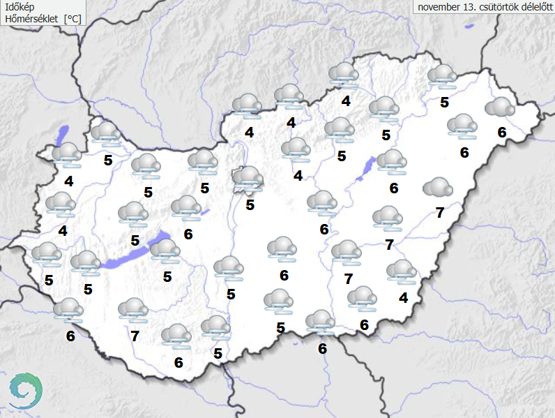 Az ország csaknem teljes területén tartósan borult, párás, ködös idő várható, napközben némileg javulhatnak a látási viszonyok. Kisebb körzetekben – a délnyugati határ közelében és a hegyvidéki tájakon – szakadozhat a rétegfelhőzet, kisüthet a nap. Legfeljebb jelentéktelen szitálás fordulhat elő. A légmozgás gyenge lesz. A legmagasabb nappali hőmérséklet általában 5 és 9 fok között alakul, a napos körzetekben viszont 10 fok feletti maximumok is lehetnek. Késő este 3, 8 fok várható.