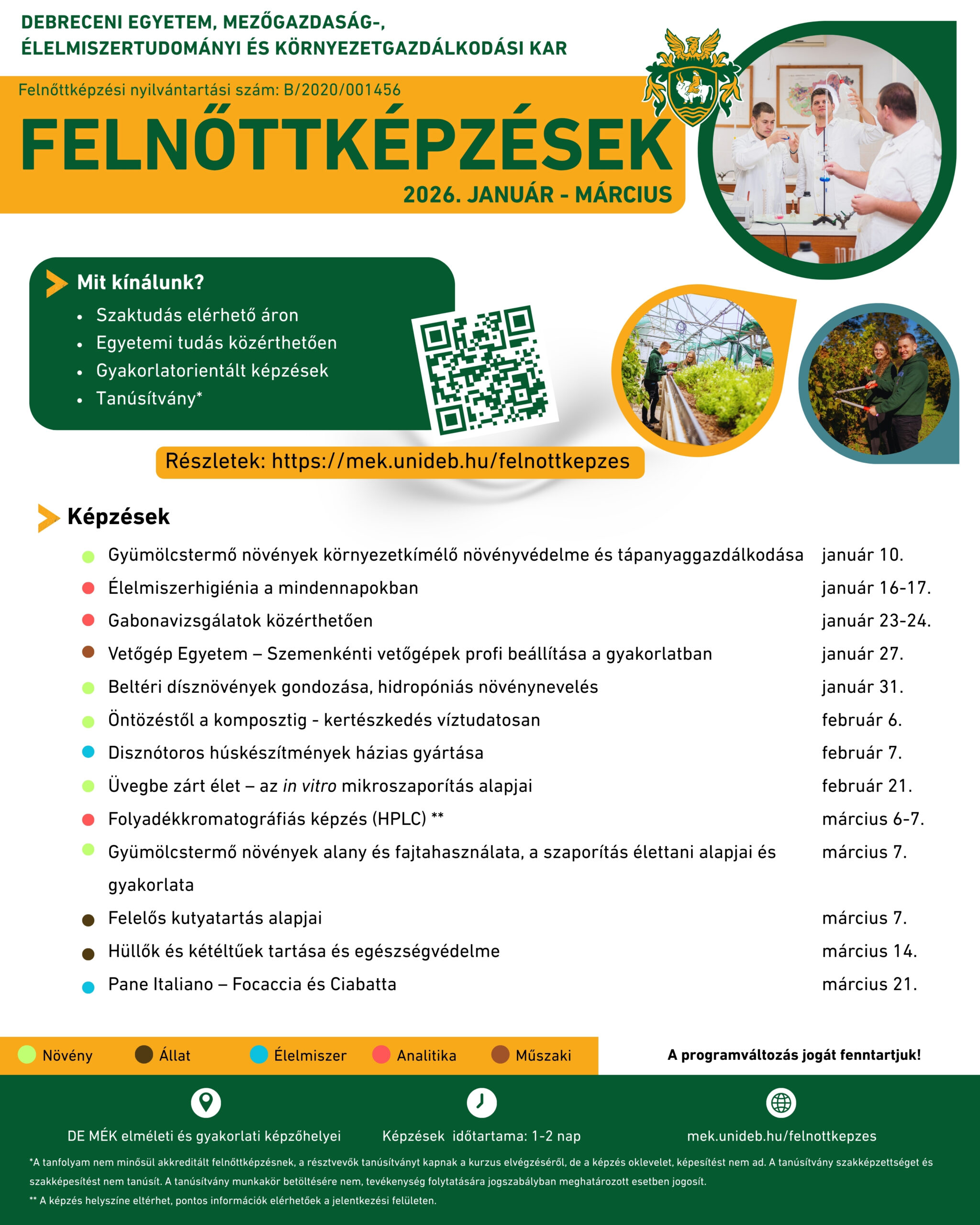 Új és sokszínű felnőttképzési palettával indítja a 2026-os évet a Debreceni Egyetem Mezőgazdaság-, Élelmiszertudományi és Környezetgazdálkodási Kara. A januártól elérhető új kurzusok a modern agrártudománytól a gasztronómián át egészen az egzotikus állatok világáig vezetnek – mindezt gyakorlatorientált formában, a kar korszerű laboratóriumaiban és oktatási tereiben.