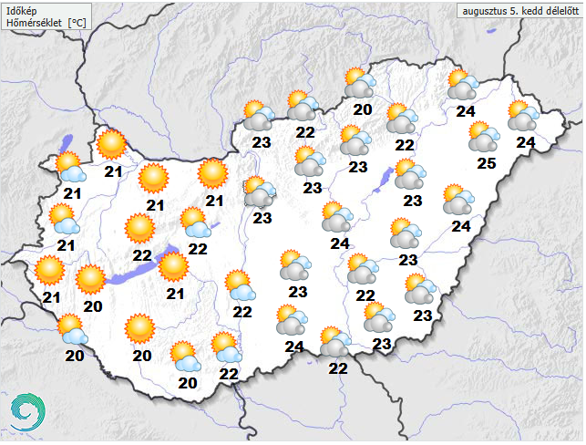 A Dunától keletre reggel, kora délelőtt még előfordulhatnak felhősebb körzetek, majd általában gomolyfelhős, napos idő várható, néhol zápor is kialakulhat. Ezzel szemben a Dunántúlon a frontfelhőzet esti, késő esti megérkezéséig derült vagy gyengén felhős lesz az ég. A légmozgás gyenge vagy mérsékelt marad. A hőmérséklet délután 26 és 31 fok között tetőzik. Késő este 17, 22 fok valószínű.