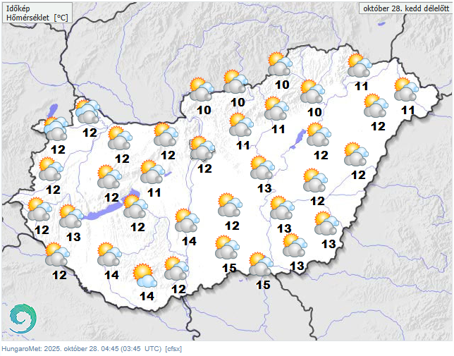 Ekkor északnyugat felől összefüggő, vastagabb felhőtakaró érkezik, amely legkevésbé az ország délnyugati részét érinti, ebből főként az északi tájakon alakulhat ki – többnyire kisebb – eső, zápor. Napközben a Dunántúl délnyugati területeit leszámítva többfelé erős, néhol viharos lökések kísérik az északnyugati szelet, amely késő délutántól egyre nagyobb területen délnyugatira fordul, ezzel együtt veszíteni kezd erejéből. A legmagasabb nappali hőmérséklet 11 és 18 fok között várható. Késő estére többnyire 6 és 12 fok közötti értékekre lehet számítani.