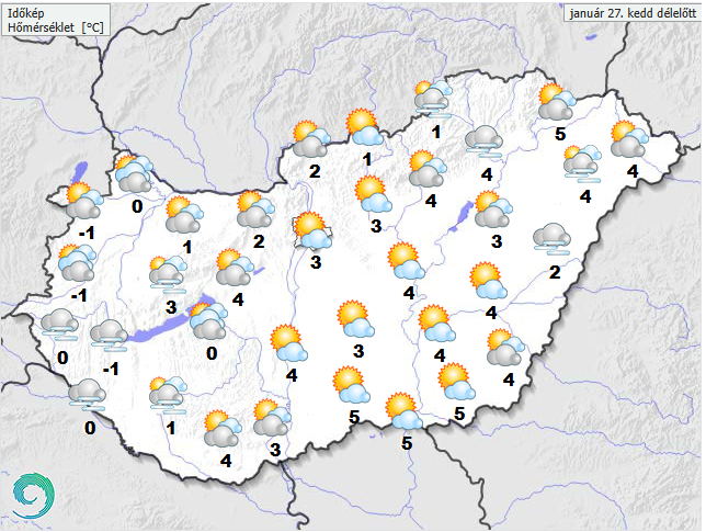 Reggelre a Tiszántúlon is megszűnik az eső. A ködös tájakon szitálás, néhol ónos szitálás előfordulhat. A légmozgás többnyire gyenge vagy mérsékelt lesz, elsősorban a magasabban fekvő helyeken fordulhat elő szélélénkülés. A legmagasabb nappali hőmérséklet általában 5 és 10 fok között várható, de a tartósabban felhős, párás részeken egy-két fokkal hűvösebb maradhat az idő. Késő estére -4 és +3 fok közé csökken a hőmérséklet.