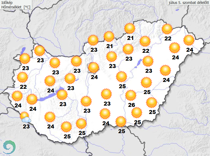 Nagyobbrészt derült, napos, száraz idő várható. Délutántól sodródhatnak fölénk nyugat felől fátyolfelhők. Az ország keleti harmadán, illetve Sopron térségében továbbra is élénk lehet az északias szél, míg másutt gyenge vagy mérsékelt marad a légmozgás. A legmagasabb nappali hőmérséklet szombaton döntően 29 és 33 fok között várható. Késő estére 19 és 26 fok közé csökken a hőmérséklet.