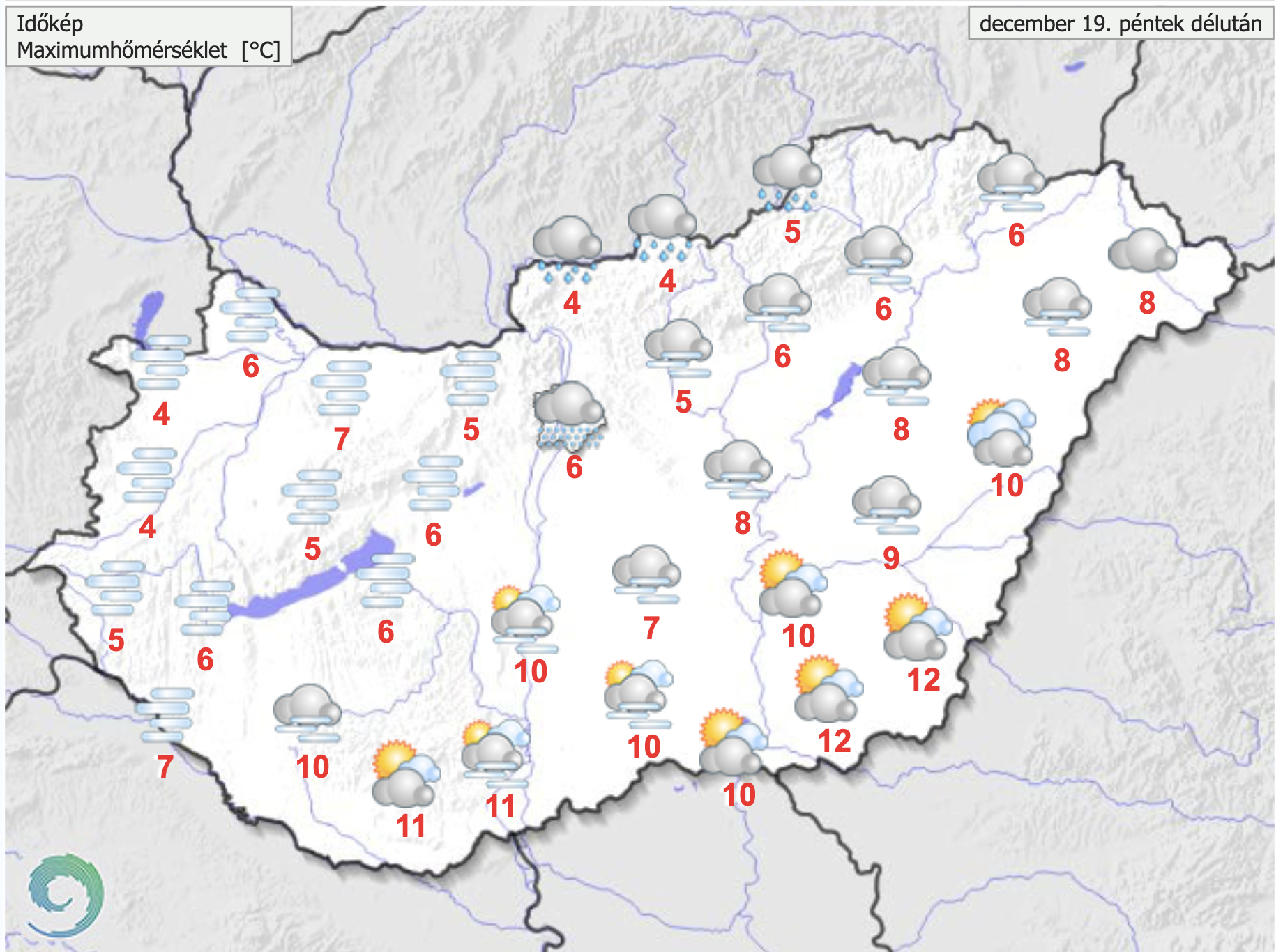 Túlnyomóan borult, párás, ködös időre van kilátás, de délen és a Tiszántúlon fokozatosan ritkul, egyes részeken fel is oszlik a köd, hosszabb-rövidebb időre a nap is kisüt. A szitálás mellett északon és a Dunától keletre néhol gyenge eső sem kizárt. A légmozgás döntően gyenge vagy mérsékelt marad. A legmagasabb nappali hőmérséklet a borult, párás, tartósabban ködös tájakon 3 és 8 fok között alakul, míg a kevésbé felhős déli és tiszántúli tájakon ennél több fokkal enyhébb lehet az idő.