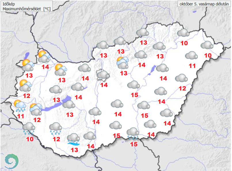 Döntően erősen felhős vagy borult idő várható, majd késő délutántól, estétől kezd el északnyugat felől csökkenni a felhőzet. Délelőtt főként a keleti és délnyugati tájakon, majd a nap második felében inkább a déli megyékben fordulhat elő eső, záporeső. Az északnyugati, nyugati szelet élénk, néhol erős lökések kísérhetik. A legmagasabb nappali hőmérséklet általában 10 és 15 fok között várható, de a tartósabban csapadékos keleti és délnyugati határvidéken ennél kissé hűvösebb maradhat az idő.