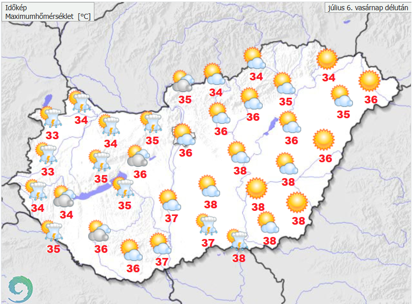 A fátyol- és gomolyfelhők mellett sok napsütésre számíthatunk. A nap első felében még legfeljebb északnyugaton, északon alakulhat ki néhol zápor, zivatar. Átmeneti szünetet követően késő délutántól újabb hullámban lehet számítani előfordulásukra, melyre északnyugaton mutatkozik a legnagyobb, míg keleten a legkisebb esély. Akár heves zivatarok is lehetnek. A déli, délnyugati szél több helyen megélénkül, a zivatarokat viharos lökések is kísérhetik. A hőmérséklet csúcsértéke többnyire 32 és 38 fok között várható.