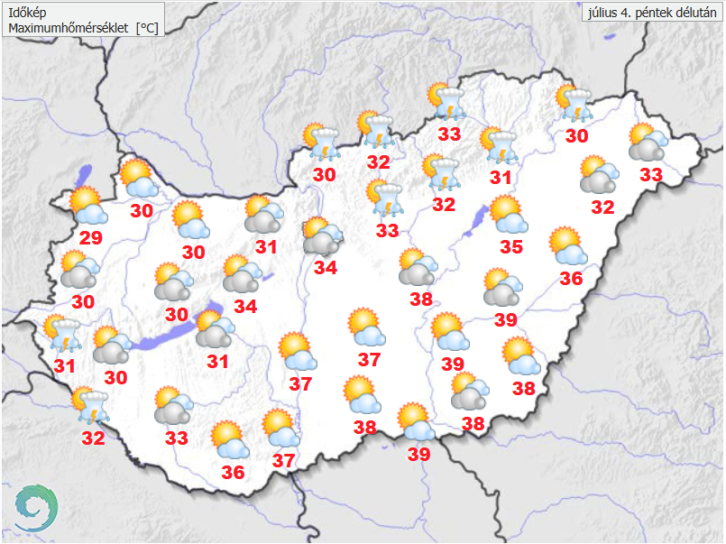Ma hidegfront érkezik, amely mentén elsősorban az Északi-középhegység, az Észak-Alföld térségében, illetve a Délnyugat-Dunántúlon képződhetnek záporok, zivatarok. Szakadozott felhőzete mellett általában sok napsütésre számíthatunk. Az északias szél sokfelé lesz élénk, többfelé erős. A legmagasabb nappali hőmérséklet döntően 32 és 39 fok között alakul, de az északnyugati, északi tájakon ennél pár fokkal alacsonyabb is lehet a maximum. Késő estére 18 és 27 fok közé csökken a hőmérséklet.