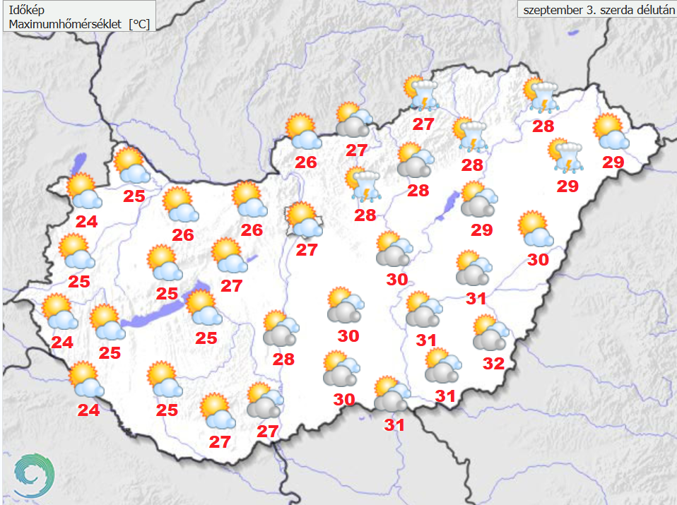 Fokozatosan szakadozik, gomolyosodik az összefüggő felhőzet, és a gomoly- illetve fátyolfelhők mellett általában sok napsütés várható. Eső, záporeső, zivatar csak kevés helyen, nagyobb eséllyel az északkeleti, keleti országrészben fordulhat elő. Főként a Dunántúlon kísérhetik élénk lökések az északnyugati szelet. Zivatar környékén átmenetileg erős, esetleg viharos széllökés is lehet. A legmagasabb nappali hőmérséklet 24, 32 fok között várható, délkeleten lesz a melegebb. Késő estére 17 és 24 fok közé hűl le a levegő.