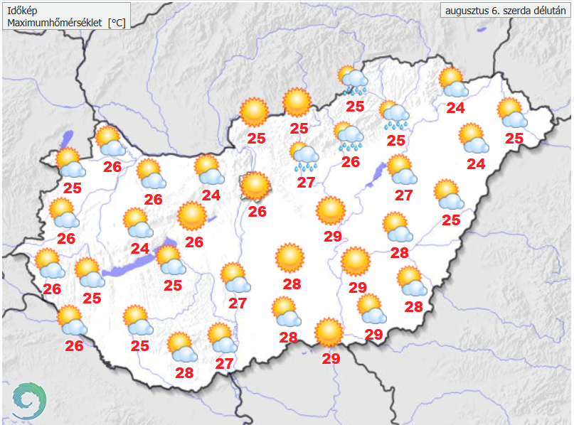 A frontális felhőzet délelőtt a keleti és déli tájakat is elhagyja, de délelőttig még elszórtan előfordulhat belőle gyenge csapadék. Ezt követően már mindenütt napos, gomolyfelhős időre számíthatunk, csak néhol keleten alakulhat ki kisebb záporeső. Az északias szél élénk, többfelé erős lesz. A legmagasabb nappali hőmérséklet 24 és 29 fok között valószínű.