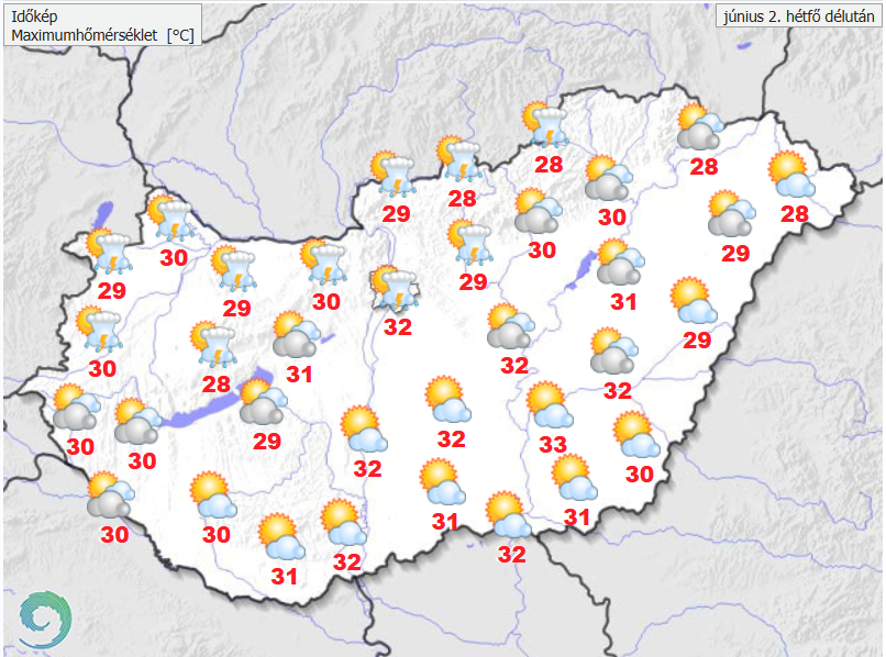 A délnyugati, déli szél az Észak-Dunántúl kivételével több helyen megélénkül, zivatarok környezetében átmenetileg erős, viharos széllökések is lehetnek. Délutánra 28 és 34 fok közé melegszik fel a levegő.