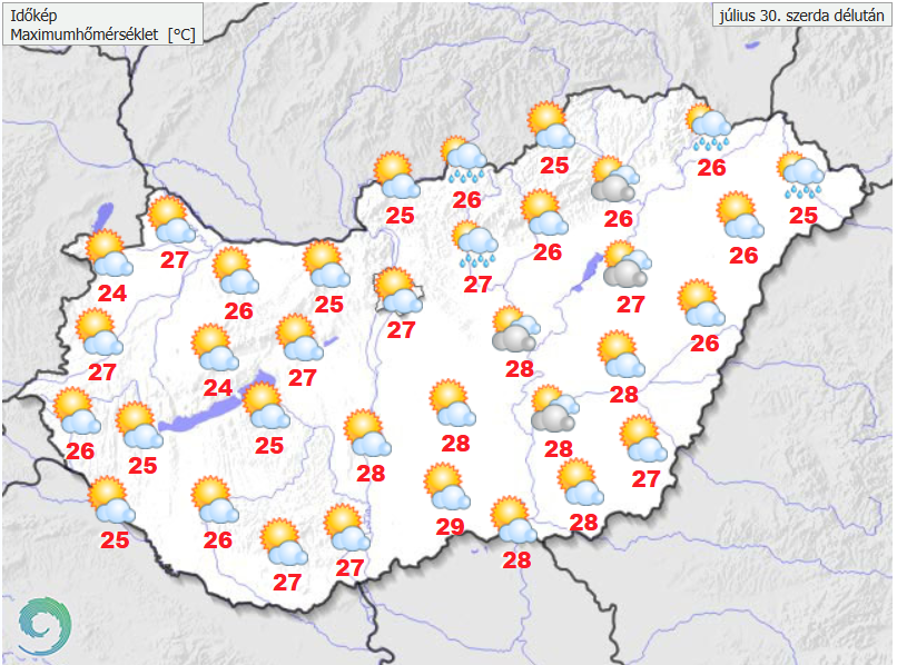 Alapvetően gomolyfelhős, napos, száraz idő valószínű, de nagyjából az Eger-Szeged vonalban húzódó összeáramlási vonal mentén erősebben gomolyfelhős idő valószínű, és ott helyenként kisebb zápor is lehet. Az északnyugati, északi szél napközben megélénkül. A legmagasabb nappali hőmérséklet 24 és 29 fok között várható.