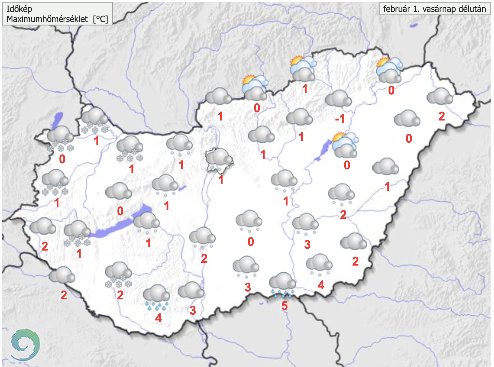 Fokozatosan javulnak a látási viszonyok. Folytatódik az általában borult idő, ugyanakkor kiemelten az északkeleti tájakon és az Északi-középhegység térségében időszakosan vékonyodhat, szakadozhat a felhőzet, és rövidebb időszakokra a nap is kisüthet. A csapadék súlypontja tovább tevődik délnyugat felé, az északkeleti harmadban már száraz idő valószínű. Másutt összességében több helyen fordulhat elő időszakos gyenge intenzitású csapadék – jellemzően havazásra, hószállingózásra lehet számítani, de a déli és keleti megyékben nappal havas eső, eső, szitálás is lehet. Az északkeleti, keleti szél az északkeleti és délnyugati tájakon helyenként élénk lesz. A legmagasabb nappali hőmérséklet jellemzően -2 és +4 fok között alakul, de a déli tájakon ennél kissé melegebb is lehet.