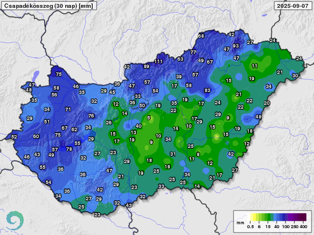 30 napos csapadékösszeg 2025. szeptember 7-ig (mm)