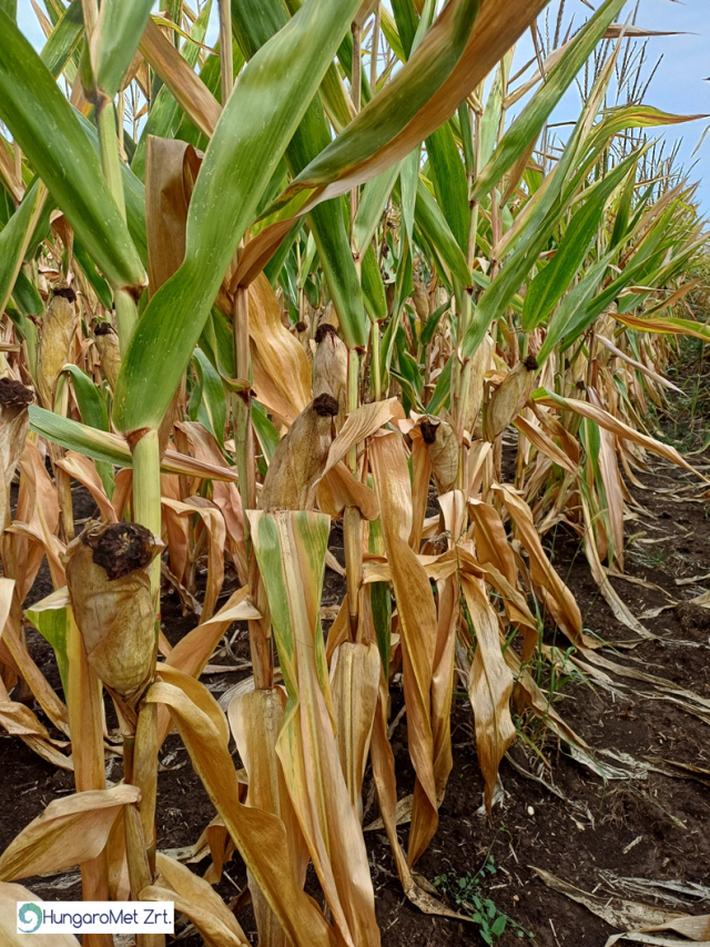 Idén a talajok alaposan átnedvesedtek a márciusi esőzések során. Április első fele viszont országszerte száraz idővel telt, sokat száradt a felszínközeli talajréteg. A hőmérséklet is visszaesett, a talaj hőmérséklete csak a hónap közepére érte el tartósan a vetéshez optimális 10 Celsius fokos küszöbértéket. A hónap közepétől fordult csapadékosabbra az időjárás, a több hullámban érkező záporok, zivatarok azonban területileg nagyon egyenetlenül öntöztek. A délnyugati, középső és északi országrészek bőven kaptak csapadékot, míg az Alföldön nagyobb, a Kisalföldön kisebb területek csaknem teljesen szárazon maradtak, így arrafelé igen nehézkes volt a kelés, a szezon rögtön aszályos idővel indult. Május második hetétől hűvösre fordult az idő, de csapadék nem esett elég és az is egyenetlenül. Az Alföld jelentős része kimaradt a csapadékból, arrafelé nem enyhült az aszály, kritikussá vált a helyzet. A magok ott is kikeltek, de szenvedtek az aszálytól. Május utolsó dekádjában érkezett jelentősebb eső a keleti tájakra is, mely átmenetileg sokat javított a körülményeken, de a hónap vége és a június ismét száraz időt hozott. Medárd sem hozta meg a várt csapadékot, a hónap közepére az aszály az egész országra kiterjedt és egyre fokozódott. Egész június alig hozott csapadékot, az aszály egyre nagyobb mértéket öltött, majd július első hetének végén tetőzött. Július második hetében több hullámban országos csapadék érkezett, mely sokfelé életmentő volt. Szeszélyes területi eloszlásban az ország mintegy harmada alaposan megázott (>40 mm), harmada 20-40 mm-t kapott, harmadán viszont kevés esett. Július végén majd augusztus elején érkeztek újabb jelentősebb esők, de ezeknek is szeszélyes volt a területi eloszlása, egyes térségek csaknem teljesen kimaradtak az esőből. Az aszály átmeneti mérséklődés után egyre nagyobb területre tért vissza, a kukoricát többfelé elkezdték lesilózni, mert nem hozott volna termést. Ahogy a csapadékban, a terméskilátásokban is hatalmas különbségek alakultak ki az országon belül az öntözetlen kukoricatáblákon. Augusztus közepén egyre többfelé megindult a növényszáradás, így a hónap végi esők az állományokon már csak néhol segítettek. Az április eleje óta összegzett csapadékmennyiség az egész szezonban jócskán elmaradt az optimálistól, jelenleg a Duna-Tisza közén még a 100 mm-t sem éri el.