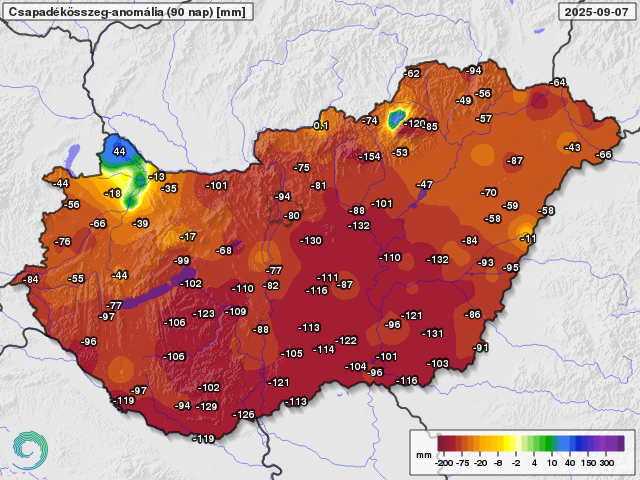 Az elmúlt 90 nap csapadékösszegének eltérése a sokéves átlagtól 2025. szeptember 7-ig (mm)