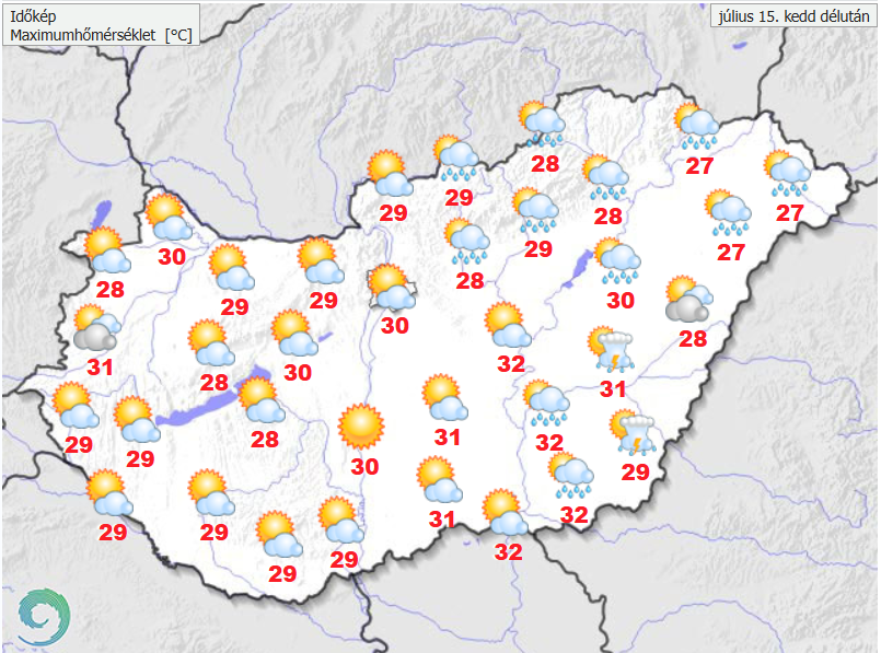 A szakadozott felhőzet kelet felé távolodik, és sok napsütésre számíthatunk gomolyfelhőkkel. Hozzávetőleg a Battonya-Miskolc vonaltól keletre alakulhat ki zápor, zivatar, amelyet felhőszakadás kísérhet. Az északnyugati szél több helyen megélénkül, zivatar környékén erős vagy viharos széllökés is lehet. A legmagasabb nappali hőmérséklet 27, 32 fok között várható.