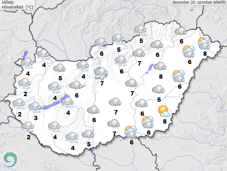Túlnyomóan borult, párás, helyenként tartósabban ködös idő várható. Napközben javulnak a látási viszonyok, elsősorban a Tiszántúlon és a Dél-Alföldön fel is szakadozhat némileg a felhőzet. Helyenként szitálás előfordulhat. A légmozgás nagyrészt gyenge vagy mérsékelt marad. A legmagasabb nappali hőmérséklet többnyire 2 és 8 fok között valószínű, de a kevésbé felhős tájakon ennél pár fokkal melegebb is lehet. Késő este 1, 6 fok közé hűl le a levegő.
