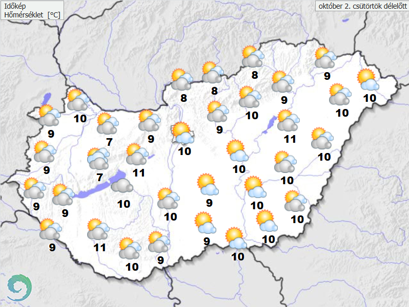 A felhős tájakon szakadozottá válik a felhőzet, a derült részeken pedig sok gomolyfelhő képződik, de ezekből legfeljebb elvétve alakulhat ki rövid életű zápor. Ezzel párhuzamosan kora délutántól összefüggő fátyolfelhőzet vonul fel délkeletről, keletről. Sokfelé megélénkül, olykor megerősödik az északi, északkeleti szél. A hőmérséklet csúcsértéke 10 és 15 fok között várható. Késő estére 4 és 10 fok közé hűl a levegő.