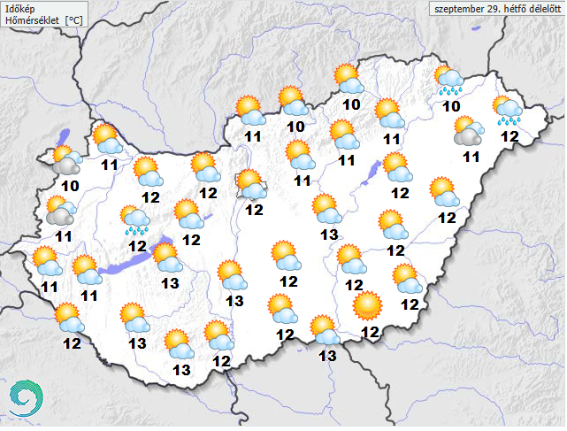 Gomolyfelhős, napos időre számíthatunk, kevés helyen záporral, egy-egy zivatarral. Az északias szél napközben a Nyugat-Dunántúlon és az északkeleti megyékben több helyen megélénkül, utóbbi tájakon erős széllökés is előfordul. A legmagasabb nappali hőmérséklet 13 és 18 fok között alakul. Késő estére 6, 13 fok közé hűl le a levegő.
