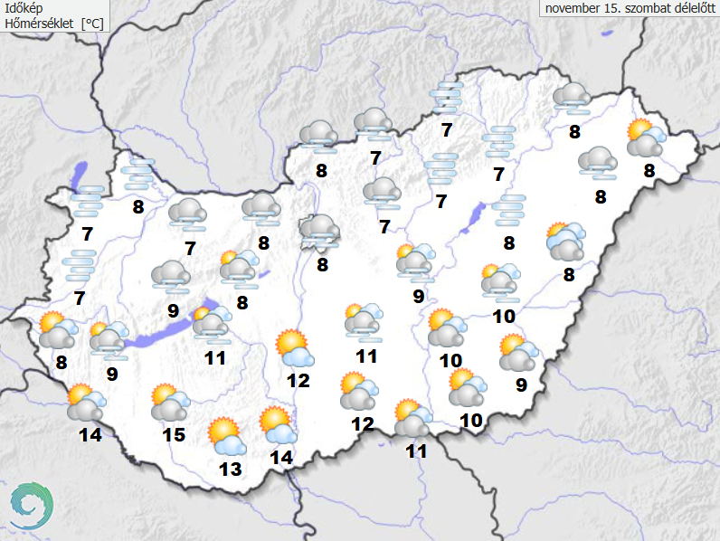 Északon marad a borongós, párás, foltokban tartósabban ködös idő. Délen megszűnik a köd, és napos idő várható fátyolfelhőkkel, illetve délután a Dél-Dunántúlon átmenetileg erősen megnövekszik a felhőzet. A szitálás mellett délután helyenként kisebb eső is kialakulhat. A déli, délnyugati szél a déli megyékben helyenként megélénkül, máshol mérsékelt marad a légmozgás. A legmagasabb nappali hőmérséklet szombaton 6 és 11 fok között alakul, de a naposabb részeken ennél több fokkal melegebb idő várható. Késő este 6, 15 fok valószínű.
