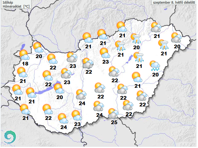 Nagyrészt fátyolfelhős, napos idő ígérkezik. Ugyanakkor főleg hazánk keleti, északkeleti felén magasabbra törnek a gomolyfelhők, melyekből záporok, zivatarok kialakulhatnak.
