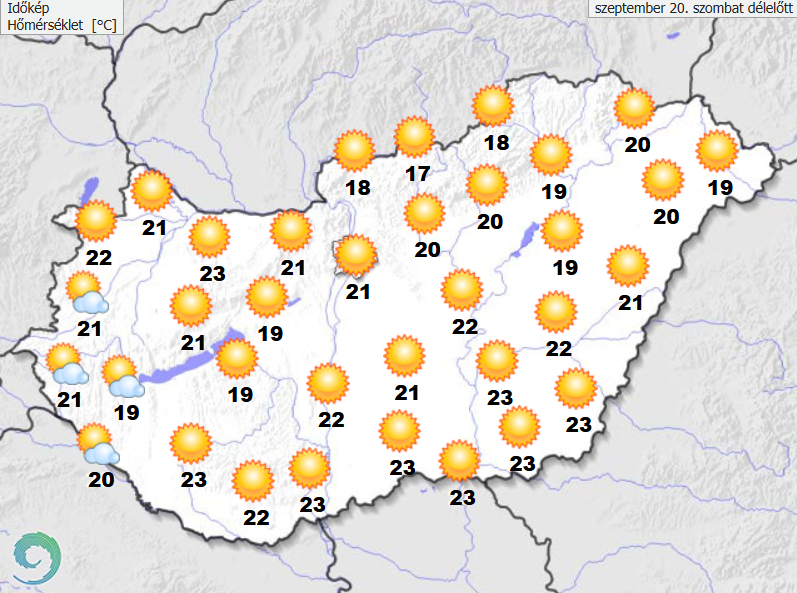 Túlnyomóan derült, csapadékmentes időre számíthatunk, a nappali órákban inkább csak a Dunántúlon lehet némi magasszintű felhő az égen. A Kisalföldön megélénkül a délire forduló szél. A csúcshőmérséklet 26 és 32 fok között valószínű. Késő estére többnyire 12 és 21 fok közé hűl le a levegő.