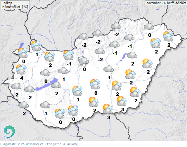Az északkeleti tájakon a déli óráktól havazás előfordulhat – kiemelten, legtovább a határ mentén -, melyet arrafelé este vegyes halmazállapot, akár átmeneti ónos eső, majd eső vált. Estétől a középső országrészben is egyre többfelé elered az eső. A déli szél többfelé élénk, helyenként erős lesz. A csúcsérték általában 2 és 8 fok között alakul, de az Északi-középhegység térségében fagypont közeli maximumokra lehet számítani. Késő este -1, +8 fok közötti értékekre lehet számítani, de fokozatosan enyhül az idő.
