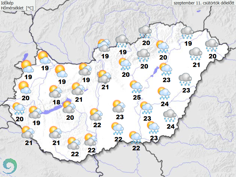 Nyugat felől előbb a Dunántúlon, majd a Duna-Tisza közén is felszakadozik, csökken a felhőzet, és gomolyfelhős, napos idő valószínű. A Tiszántúlon ugyanakkor sok felhőre számíthatunk, legfeljebb rövid időre süthet ki a nap. Délelőttig a tartós csapadék az északkeleti, keleti tájakon is megszűnik. Később a délnyugati, déli határvidéken alakulhat ki zápor, zivatar, illetve a Tiszántúlon is számíthatunk újabb esőre, záporra. A Tiszántúlon helyenként megerősödik a délnyugati szél, másutt a nyugati, északnyugati szél élénkül meg, majd estére mindenütt mérséklődik a légáramlás. A legmagasabb nappali hőmérséklet 21, 26 fok között valószínű. Késő estére 15, 21 fokig hűl le a levegő.
