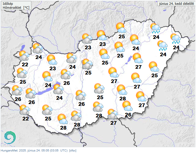Kevés helyen északkeleten, illetve kisebb eséllyel a délnyugati, nyugati megyékben fordulhat elő zápor, zivatar. Az ország északkeleti felén nagy területen kísérik élénk, olykor erős lökések az északnyugati, nyugati irányú szelet. Délután 28 és 34 fok között alakul a csúcshőmérséklet, északkeleten lesz kevésbé meleg az idő. Késő estére 20 és 27 fok közé csökken a hőmérséklet.