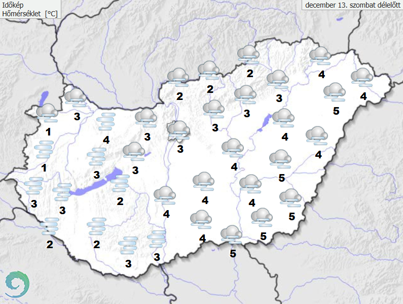 Túlnyomóan borult, párás, egyes részeken tartósan ködös idő várható. Szitálás helyenként előfordulhat. A légmozgás gyenge vagy mérsékelt lesz. A legmagasabb nappali hőmérséklet 2 és 6 fok között alakul. Késő este 0, +4 fok valószínű.