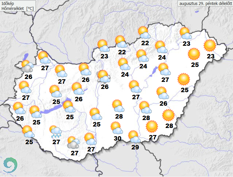 A nap első felében a szaharai eredetű por szűrheti, míg nyugaton a változó vastagságú felhőzet időnként zavarhatja a napsütést, melyből néhol csapadék sem kizárt. Délutántól nyugat felől egyre jobban megnövekszik a felhőzet, nő a csapadék kialakulási esélye is – estig főként a Nyugat-Dunántúlon lehet helyenként záporra, zivatarra számítani. A délies szél többfelé megélénkül, olykor megerősödhet, a zivatarok környezetében akár viharos lökések is előfordulhatnak. A legmagasabb nappali hőmérséklet többnyire 32 és 37 fok között alakul. Késő estére 18 és 28 fok közé csökken a hőmérséklet.