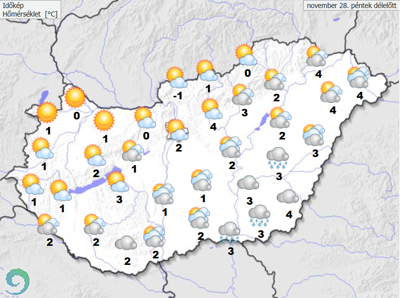 Jobbára összefüggő felhőtakaró terjeszkedik lassanként északnyugat, észak felé, helyenként kisebb csapadékot is okozhat. Azonban az ország megközelítőleg északnyugati, északi harmadán késő délutánig még nagyrészt kevés felhőre lehet számítani. Az északi szél a Tiszántúlon is fokozatosan mérséklődik. A legmagasabb nappali hőmérséklet 3 és 7 fok között várható. Késő estére többnyire -2 és +4 fok közé hűl le a levegő.