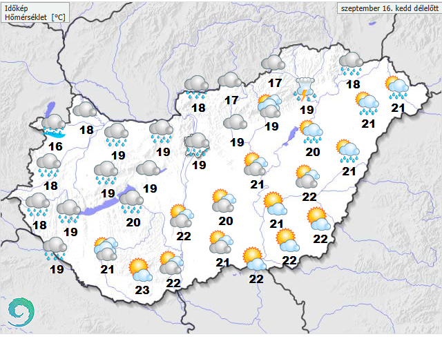 Szórványosan valószínű csapadék: nyugaton, északnyugaton főleg eső, másutt záporok, néhol – nagyobb eséllyel keleten – zivatarok is kialakulhatnak. Az északnyugatira forduló szelet élénk, helyenként erős lökések kísérhetik, emellett zivatarok környezetében viharos lökés is előfordulhat. A legmagasabb nappali hőmérséklet tág határok között mozoghat, nyugaton 17, míg a délkeleti határ mentén akár 28, 29 fokot is mérhetünk. Késő estére 11 és 17 fok közé hűl le a levegő.
